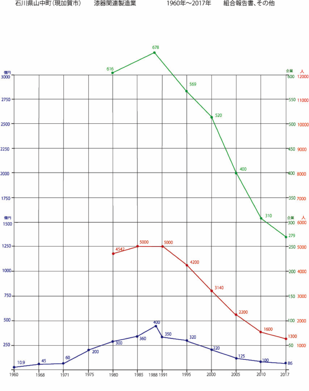 山中漆器の産地は行政区分上、1960〜2000年代は町であり、2005年に加賀市に合併されている。そのため、工業統計調査から正確な数値は得られなかった。結果として、従業員3人以下の企業も含まれているので、他産地と単純に比較することはできない。